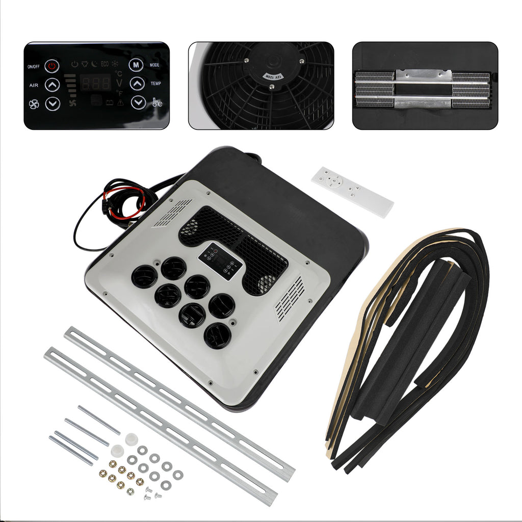 · These DC 12V products are now widely used in the ventilation and air conditioning systems for the cabs in trucks, tractors, motorhomes, touring car and construction machinery. The DC Air Conditioner Kit is very easily connects to challenge confined space and extreme hot ambient!