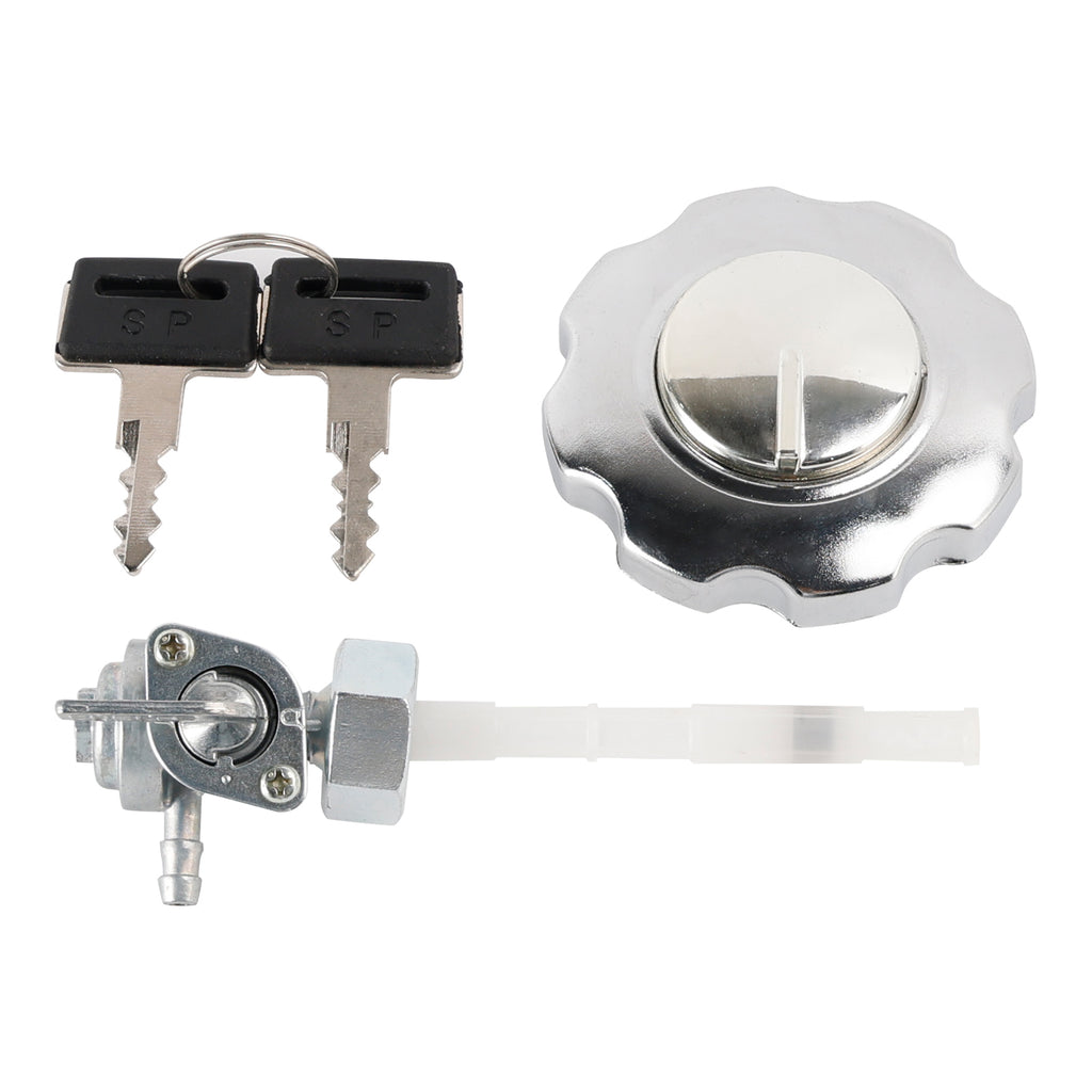 Includes chrome locking gas cap with keys and a petcock for use with 3/16" in fuel line.