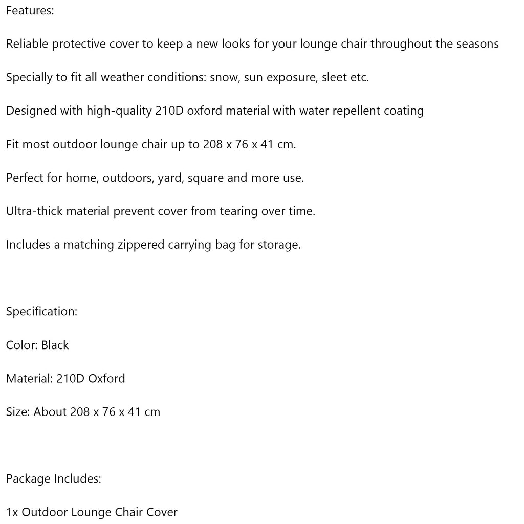 Fit most outdoor lounge chair up to 208 x 76 x 41 cm.