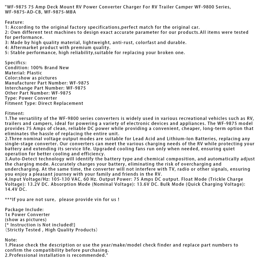 WF-9875 75 Amp Deck Mount RV Power Converter Charger For RV Trailer Camper WF-9800 Series, WF-9875-AD-CB, WF-9875-MBA