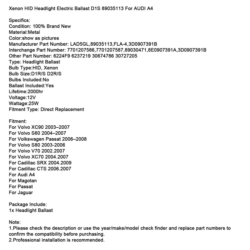 Xenon HID Headlight Electric Ballast D1S 89035113 For AUDI A4