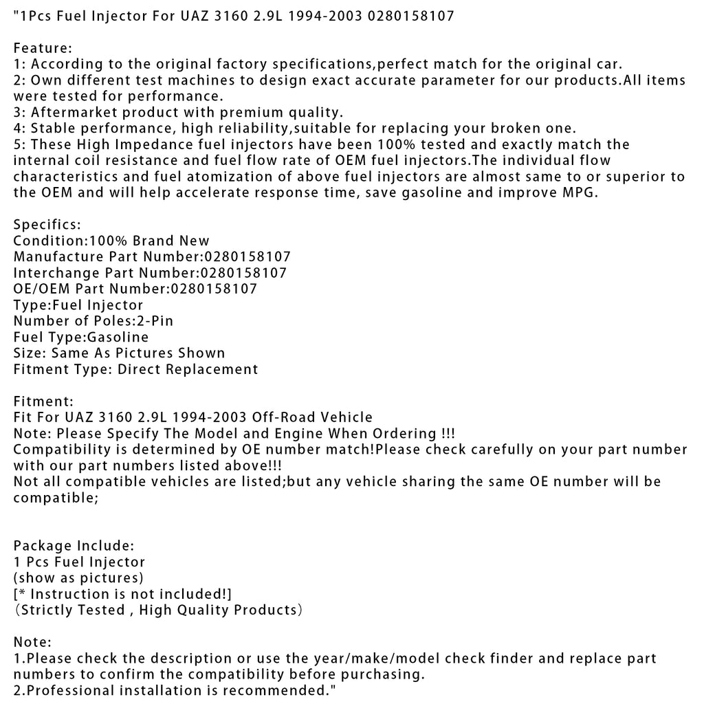 1Pcs Fuel Injector For UAZ 3160 2.9L 1994-2003 0280158107
