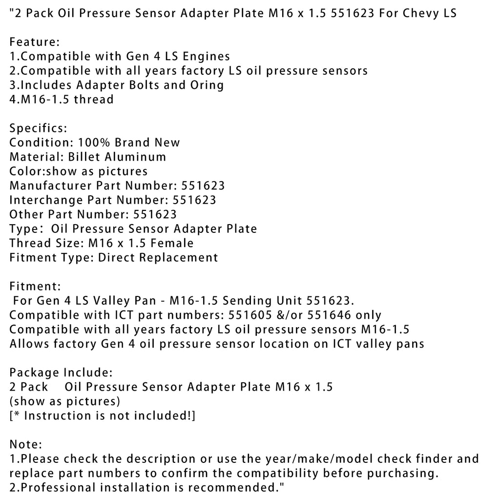 2 Pack Oil Pressure Sensor Adapter Plate M16 x 1.5 551623 For Chevy LS