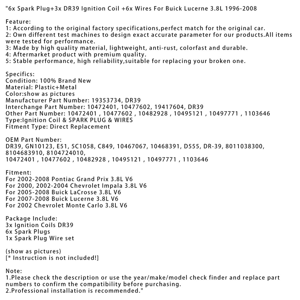 6x Vela de ignição + 3x Bobina de ignição DR39 + 6x Fios adequados para Buick Lucerne 3.8L 1996-2008