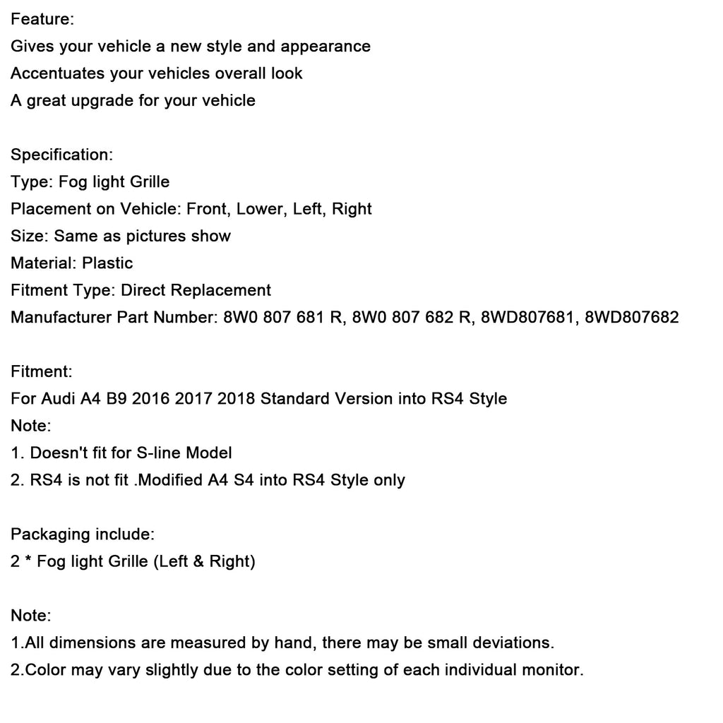 Grade para farol de neblina dianteiro 2 peças, grade inferior para para-choque, compatível com Audi A4 B9 2016-2018