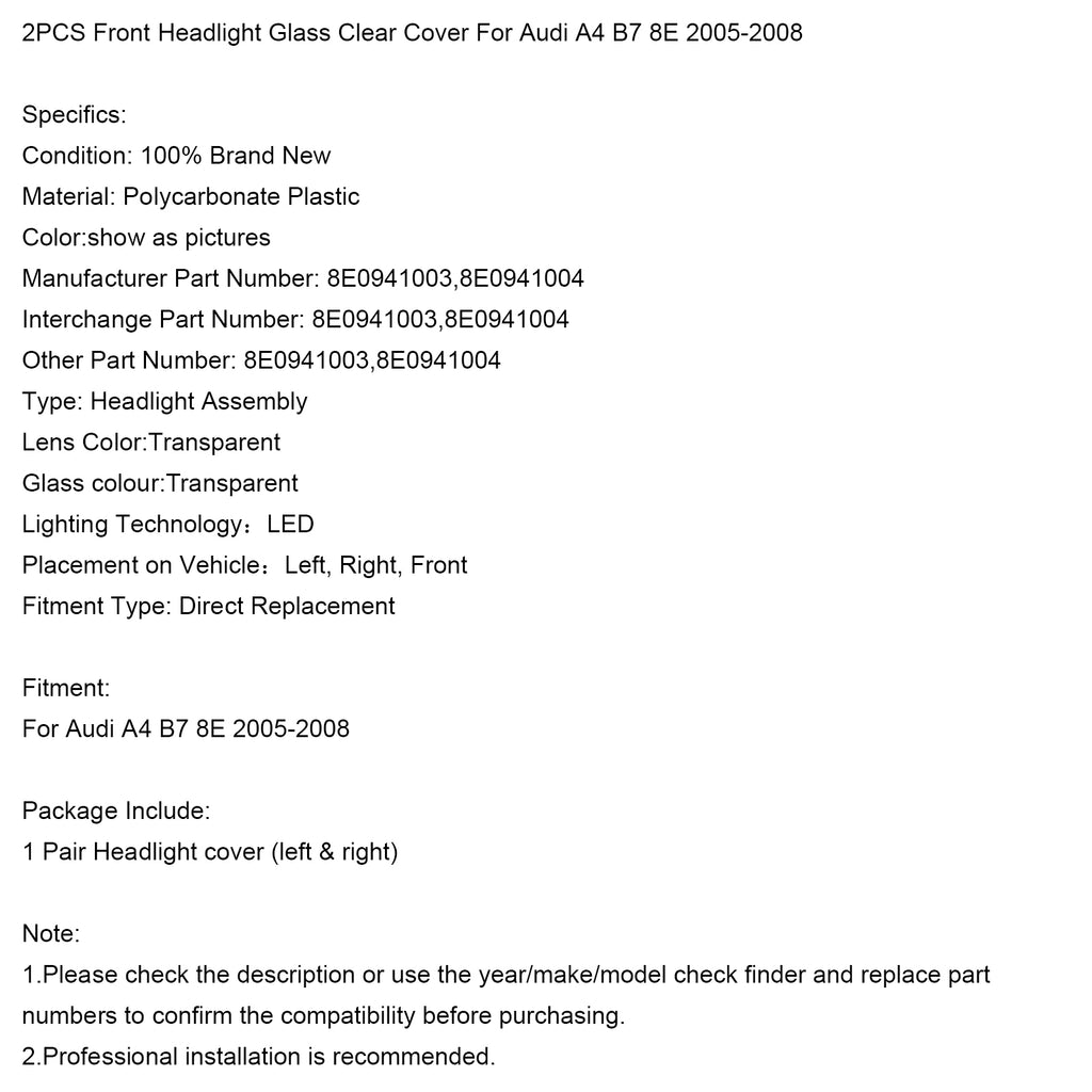 2 peças de capa transparente para farol dianteiro para Audi A4 B7 8E 2005-2008