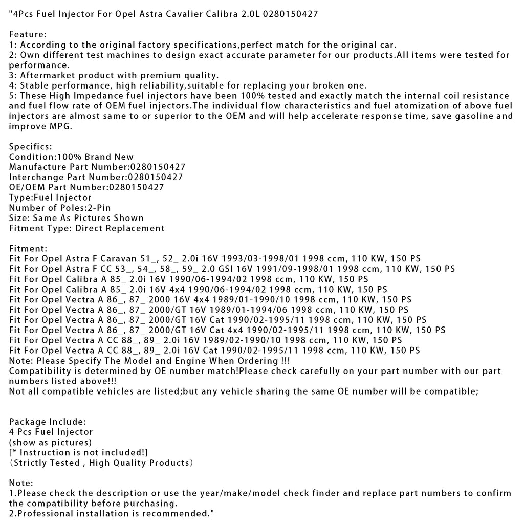 4Pcs Fuel Injector For Opel Astra Cavalier Calibra 2.0L 0280150427