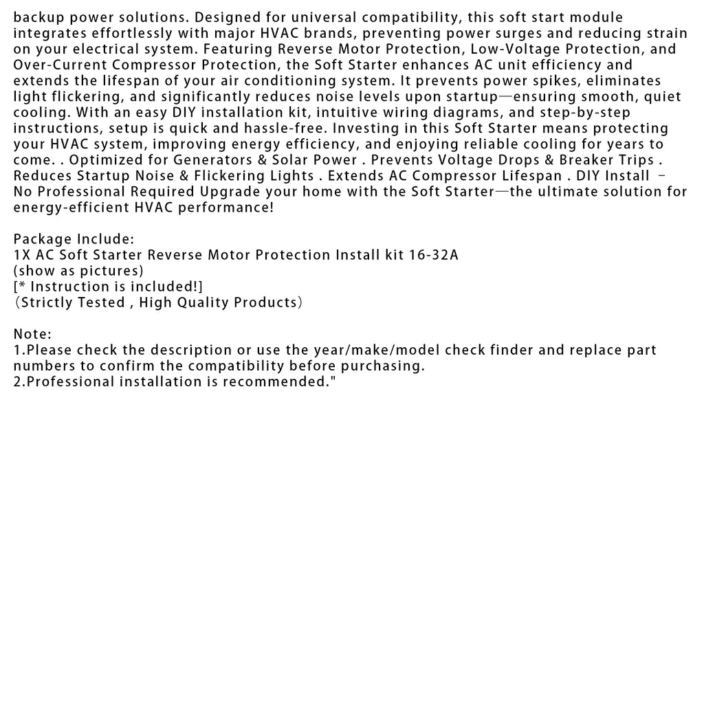 Este Soft Starter é essencial para qualquer sistema de energia residencial inteligente, garantindo o funcionamento perfeito do seu sistema HVAC com energia elétrica, geradores, carregadores de veículos elétricos, painéis solares e soluções de energia de reserva. Projetado para compatibilidade universal, este módulo de partida suave integra-se perfeitamente às principais marcas de HVAC, prevenindo picos de energia e reduzindo a sobrecarga do seu sistema elétrico. Com proteção contra reversão do motor, proteção contra baixa tensão e proteção contra sobrecorrente do compressor, o Soft Starter aumenta a eficiência da unidade de ar condicionado e prolonga a vida útil do seu sistema de ar condicionado. Ele evita picos de energia, elimina oscilações de luz e reduz significativamente os níveis de ruído na partida, garantindo um resfriamento suave e silencioso. Com um kit de instalação "faça você mesmo" fácil, diagramas de fiação intuitivos e instruções passo a passo, a configuração é rápida e sem complicações. Investir neste Soft Starter significa proteger seu sistema HVAC, melhorar a eficiência energética e desfrutar de um resfriamento confiável por muitos anos. Otimizado para geradores &Energia Solar. Evita Quedas de Tensão &Disjuntor desarma. Reduz o ruído de partida &Luzes piscantes. Prolonga a vida útil do compressor de ar condicionado. Instalação "faça você mesmo" – sem necessidade de profissional. Atualize sua casa com o Soft Starter — a solução definitiva para um desempenho de HVAC com eficiência energética!
