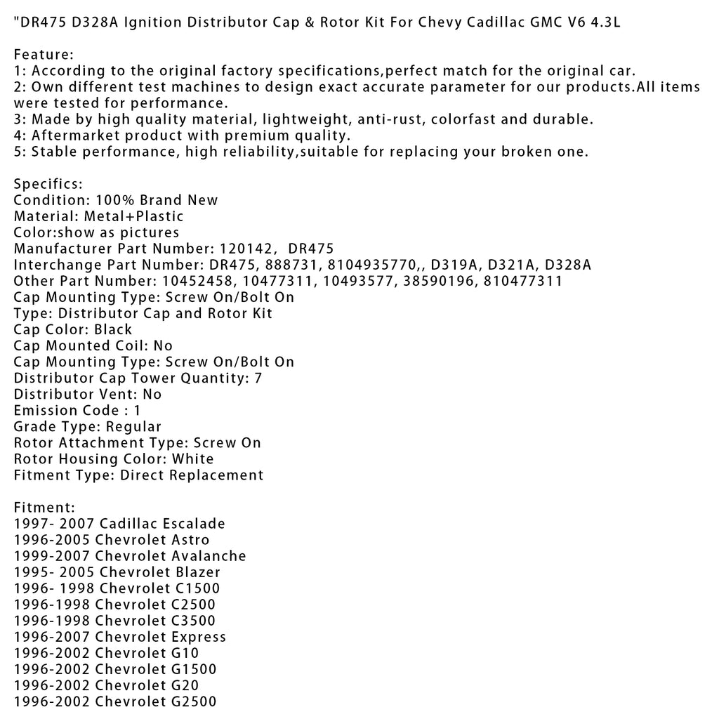 Tampa do distribuidor de ignição DR475 D328A &Kit de rotor para Chevy Cadillac GMC V6 4.3L