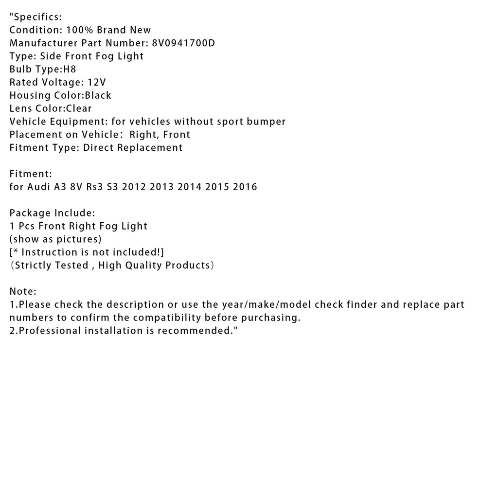 1 ks predných pravých hmlových svetiel so žiarovkami pre Audi A3 8V RS3 S3 2012-2016