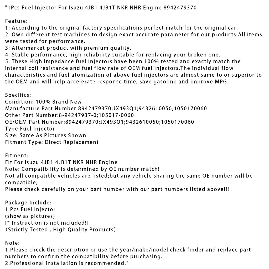 1Pcs Fuel Injector For Isuzu 4JB1 4JB1T NKR NHR Engine 8942479370