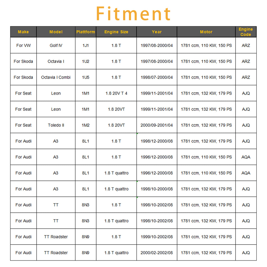 Fit For Audi TT 8N3 1.8 T 1781 ccm, 132 KW, 179 PS Engine:AJQ 1998/10-2002/08