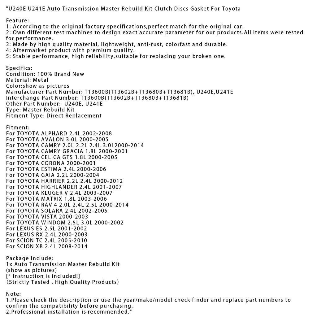 U240E U241E Auto Transmission Master Rebuild Kit Clutch Discs Gasket For Toyota