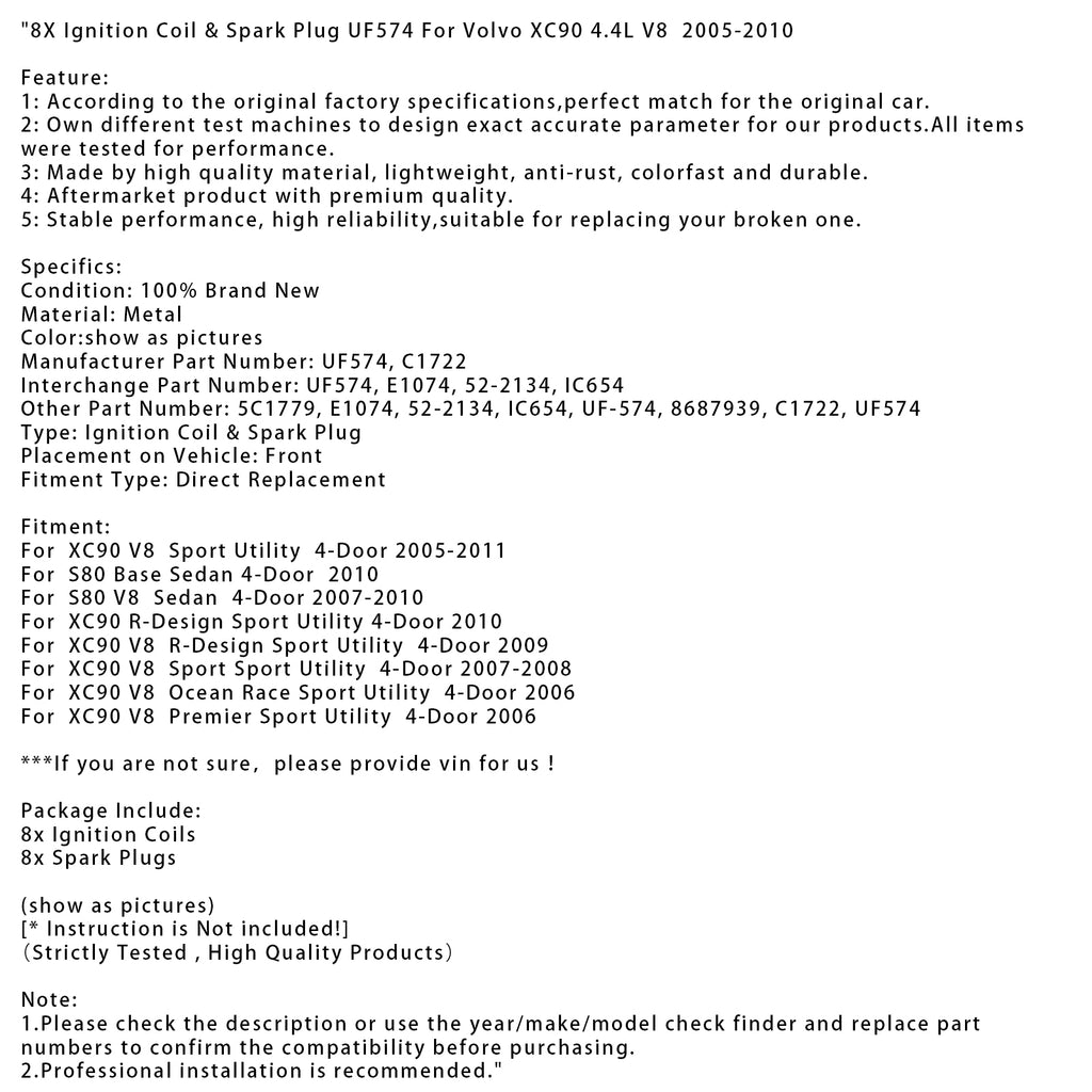 8X Ignition Coil & Spark Plug UF574 Fit For Volvo XC90 4.4L V8 2005-2010