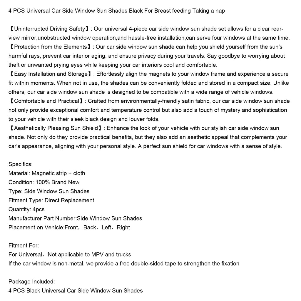 【Bezpečnosť jazdy bez prerušenia】: Naša univerzálna 4-dielna sada slnečných tieniacich tieniacich systémov na bočné okná umožňuje jasné spätné zrkadlo, nerušené ovládanie okna a bezproblémovú inštaláciu a dokáže obslúžiť štyri okná súčasne.
