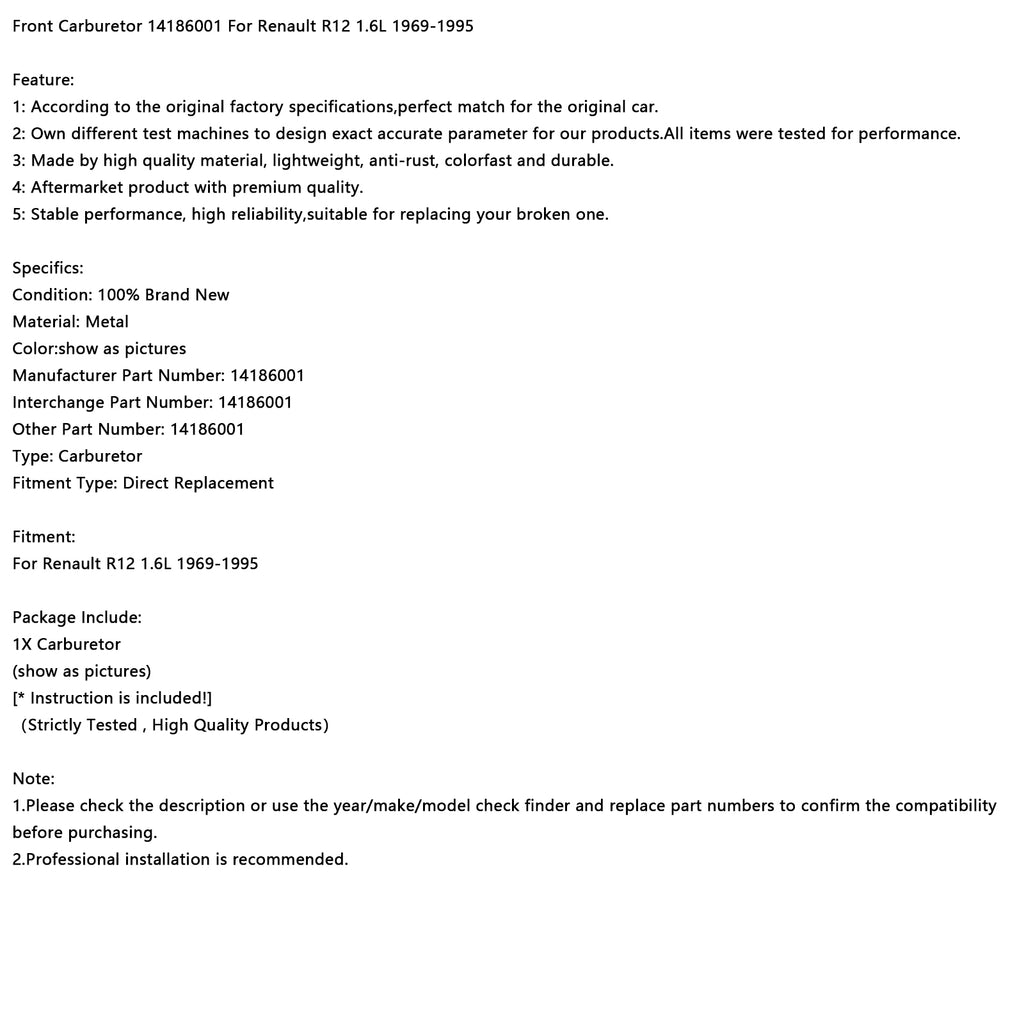Predný karburátor 14186001 pre Renault R12 1.6L 1969-1995