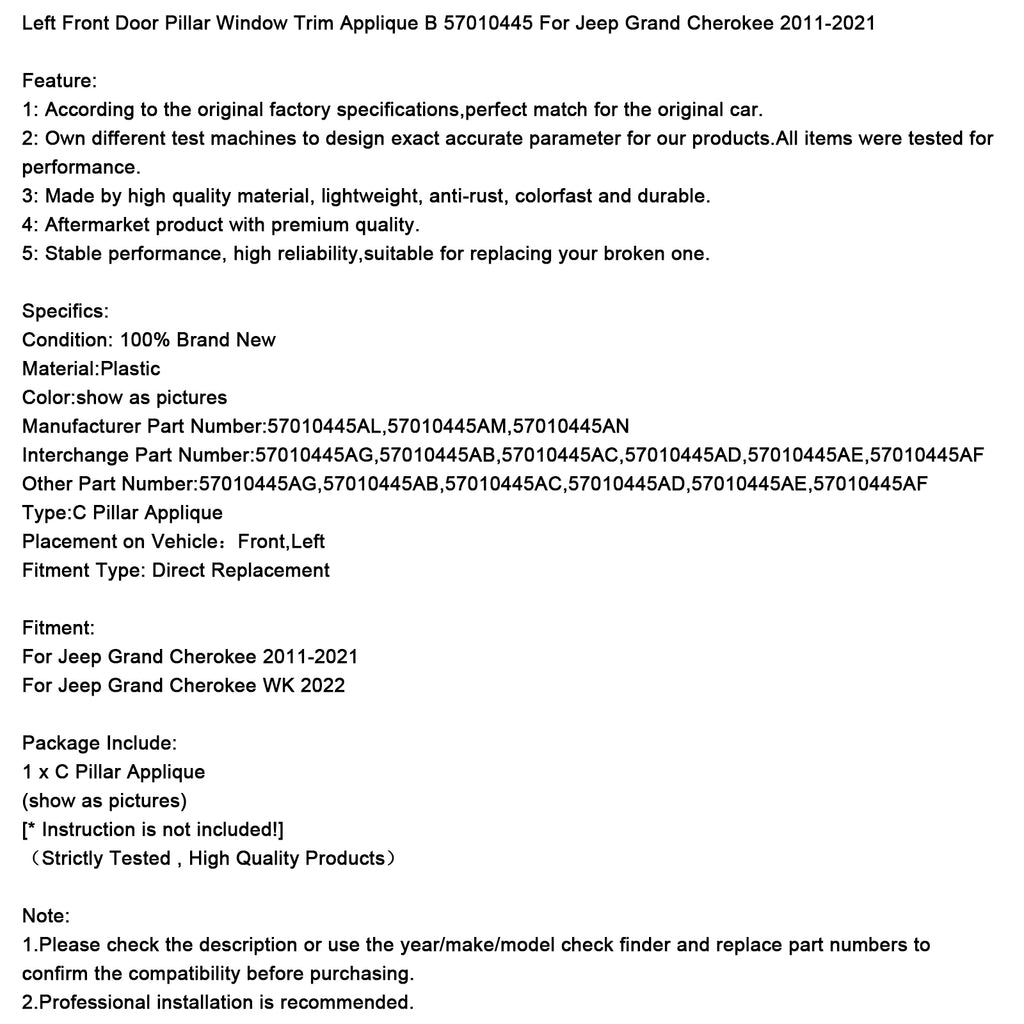 Left Front Door Pillar Window Trim Applique B 57010445 For Jeep Grand Cherokee 2011-2021