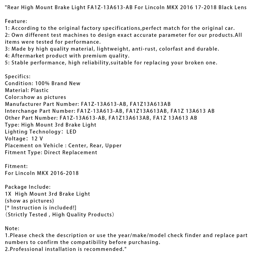 Zadné brzdové svetlo s vysokou montážou FA1Z-13A613-AB pre Lincoln MKX 2016 2017 2018, čierne šošovky