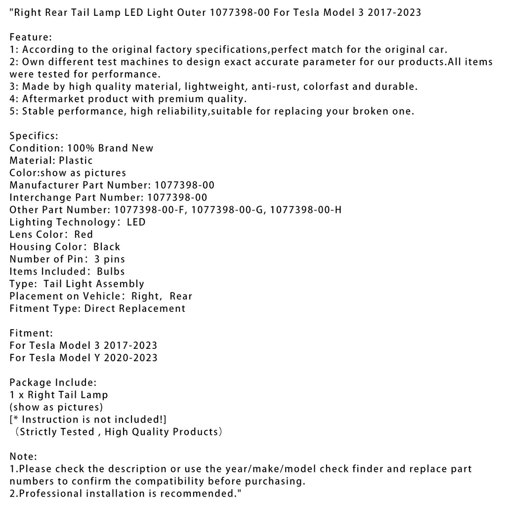 Pravé zadné LED svetlo vonkajšie 1077398-00 pre Tesla Model 3 2017-2023