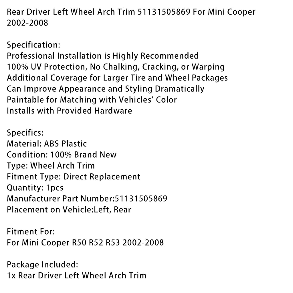 Rear Driver Left Wheel Arch Trim 51131505869 For Mini Cooper 2002-2008