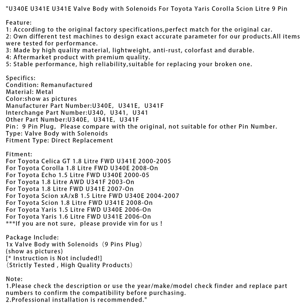 U340E U341E U341E Valve Body with Solenoids For Toyota Yaris Corolla Scion Litre 9 Pin
