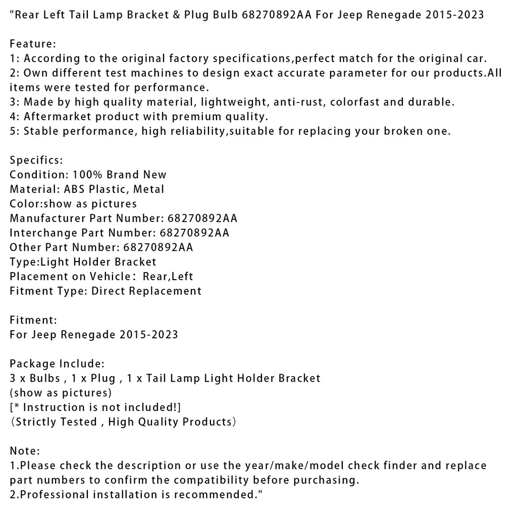 Držiak zadného ľavého zadného svetla &Žiarovka 68270892AA pre Jeep Renegade 2015-2023