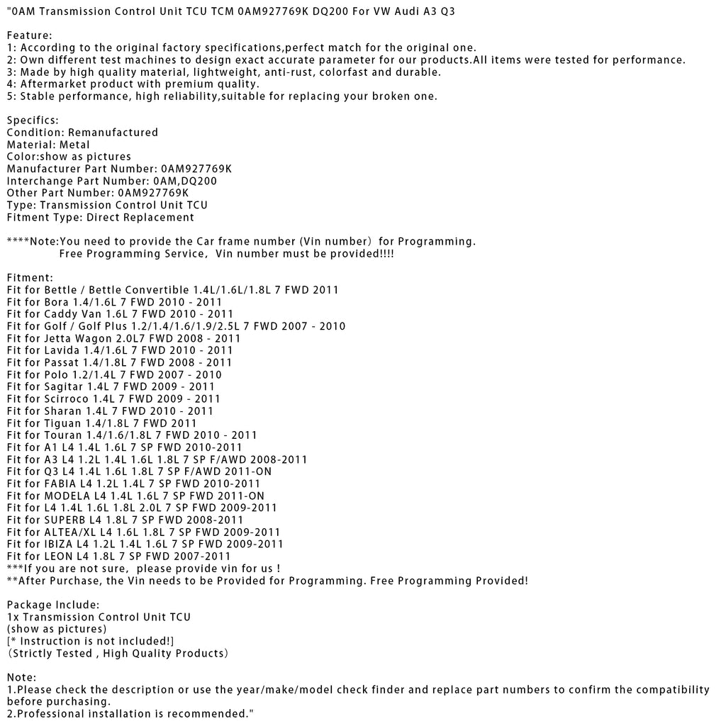 0AM Transmission Control Unit TCU TCM 0AM927769K DQ200 For VW Audi A3 Q3