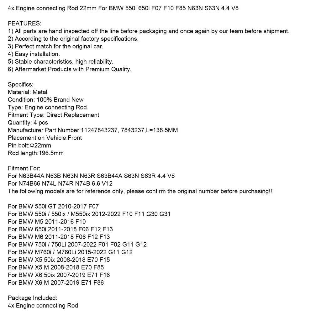 4x Vevstake 22mm för BMW 550i 650i F07 F10 F85 N63N S63N 4.4 V8