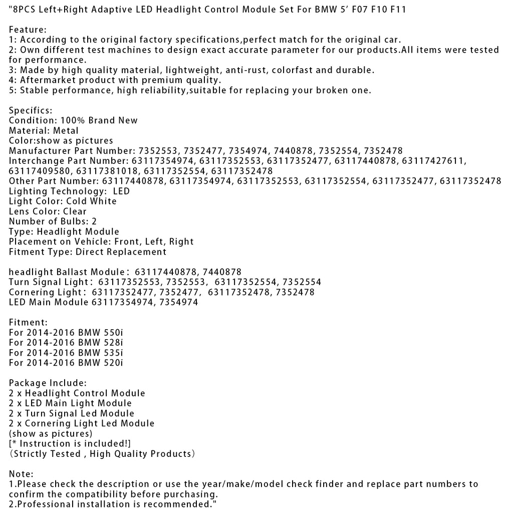 8 st adaptiv LED-strålkastarkontrollmodul för vänster+höger för BMW 5-tums F07 F10 F11