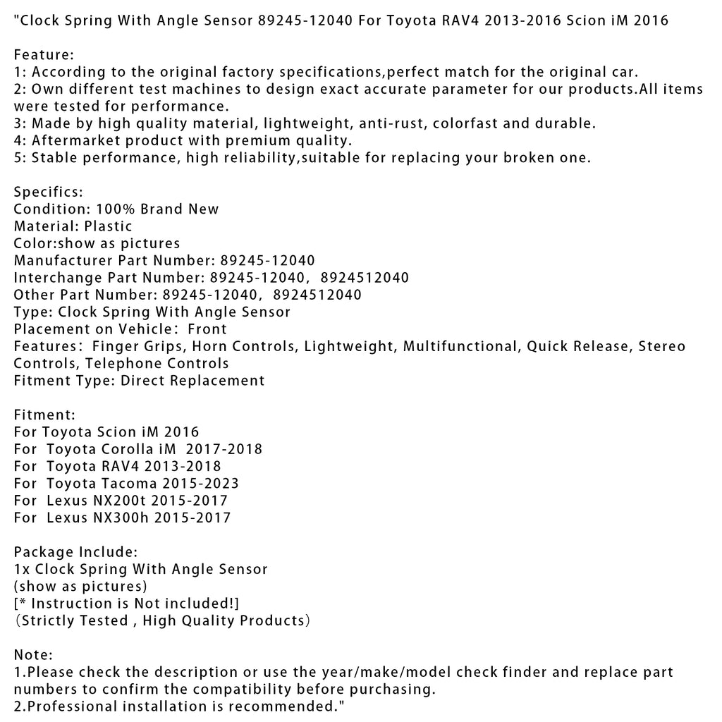 Clock Spring With Angle Sensor 89245-12040 For Toyota RAV4 2013-2016 Scion iM 2016