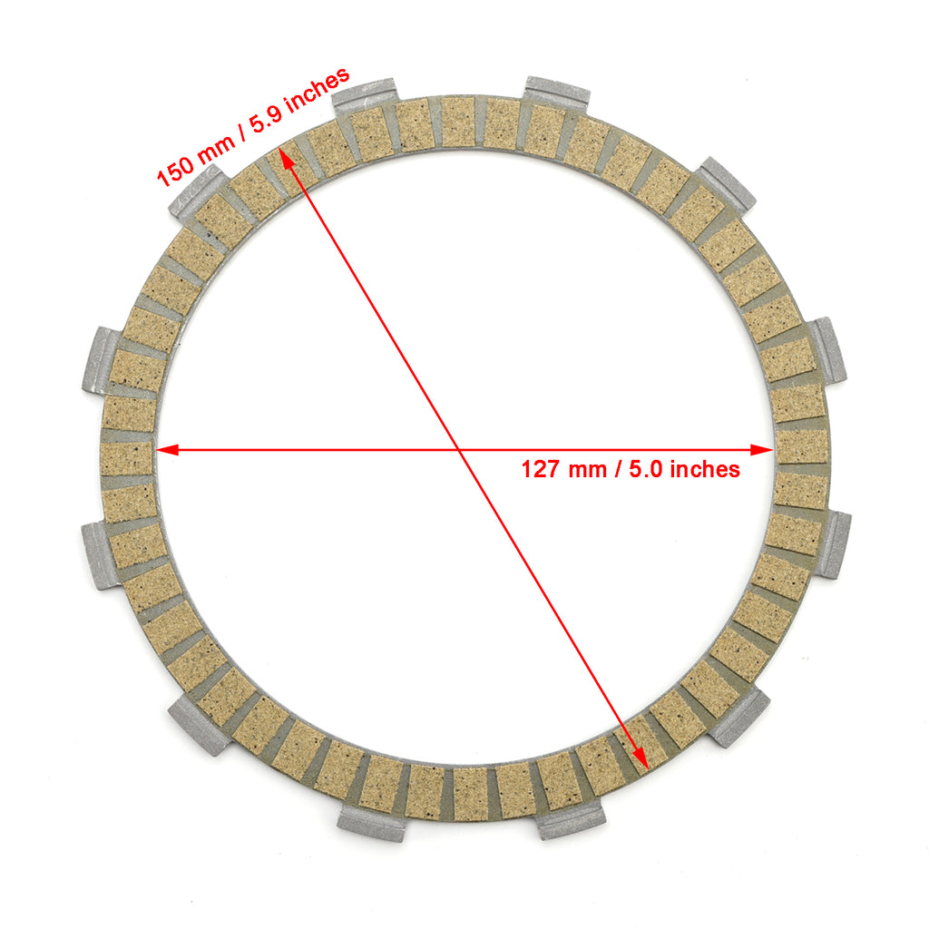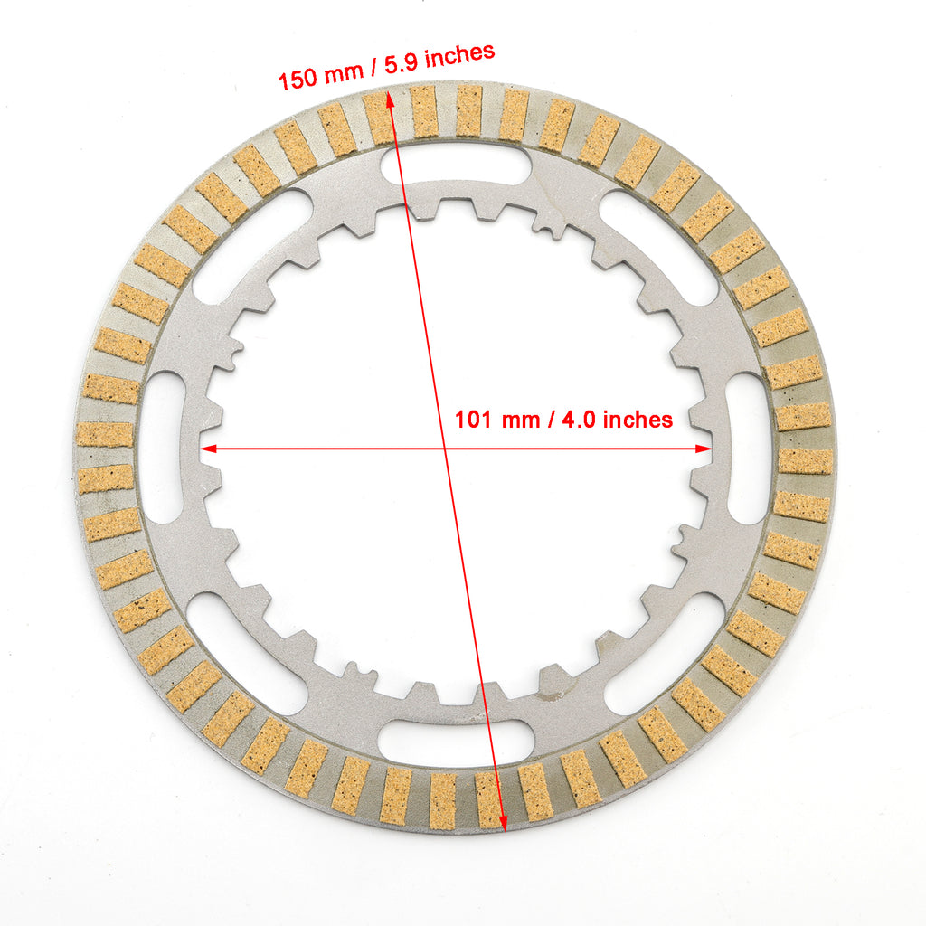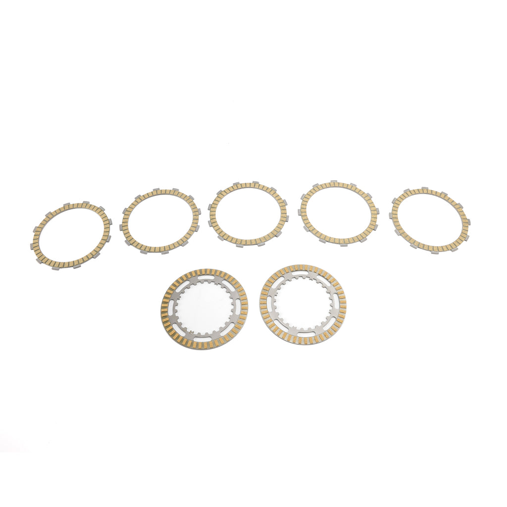 Satsen innehåller 5 friktionsplattor på härdade järnkärnor och 2 drivplattor av härdat järn.
