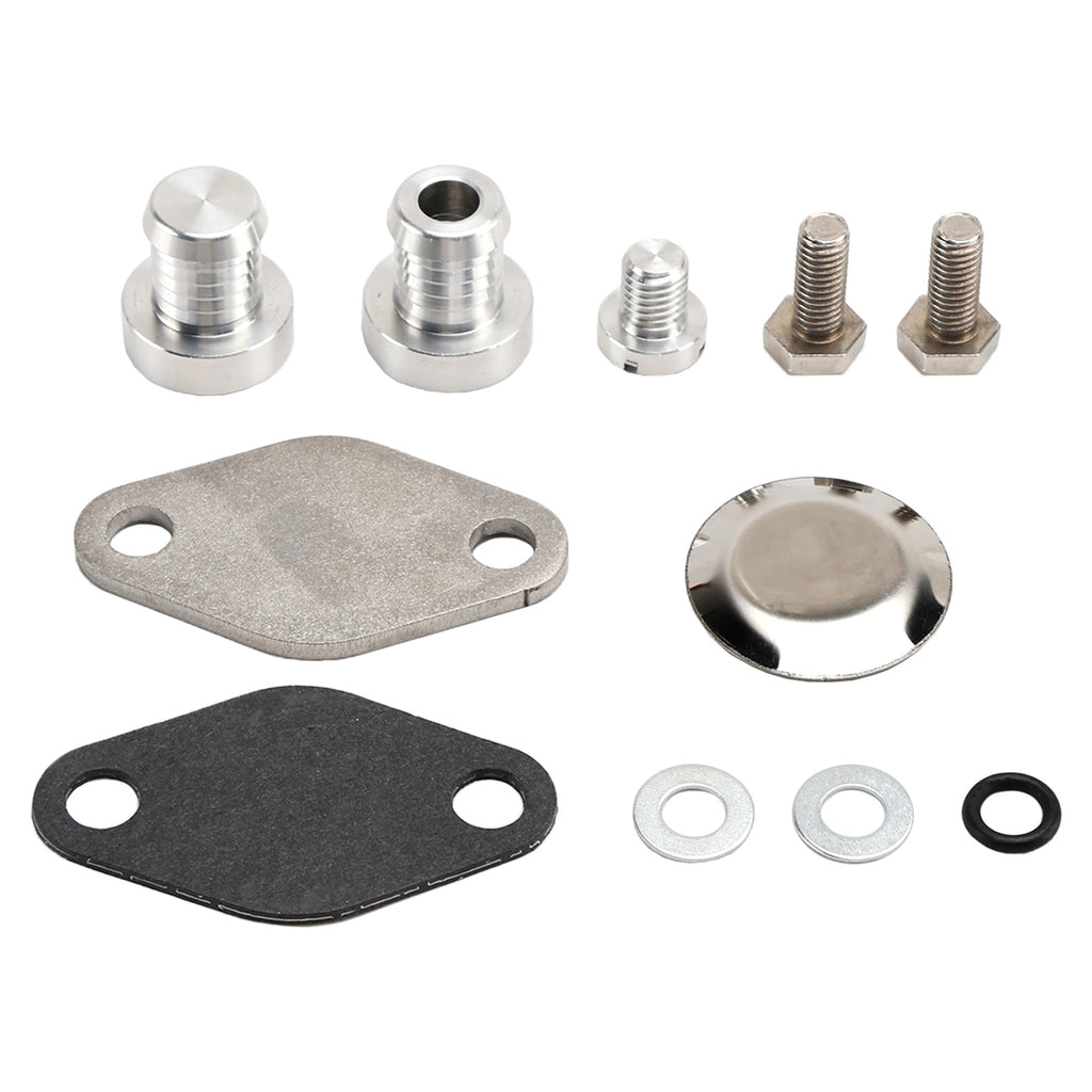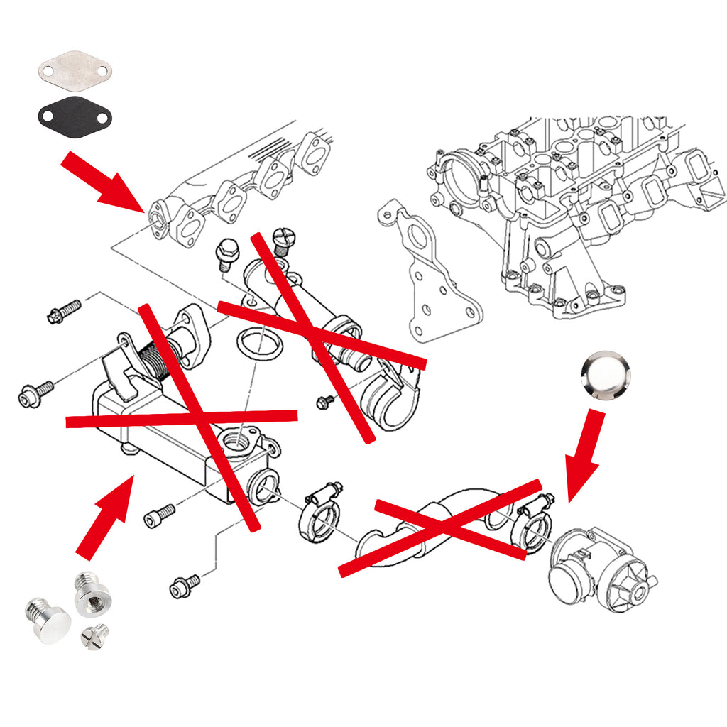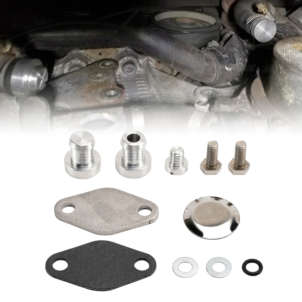 Our set includes EGR cooler hose plugs that allow you to remove the EGR cooler and EGR thermostat. With our kit you can not only remove the EGR cooler and also the thermostat. The set includes two plugs, one with a fixed one and one with the vent screw with the O-ring.