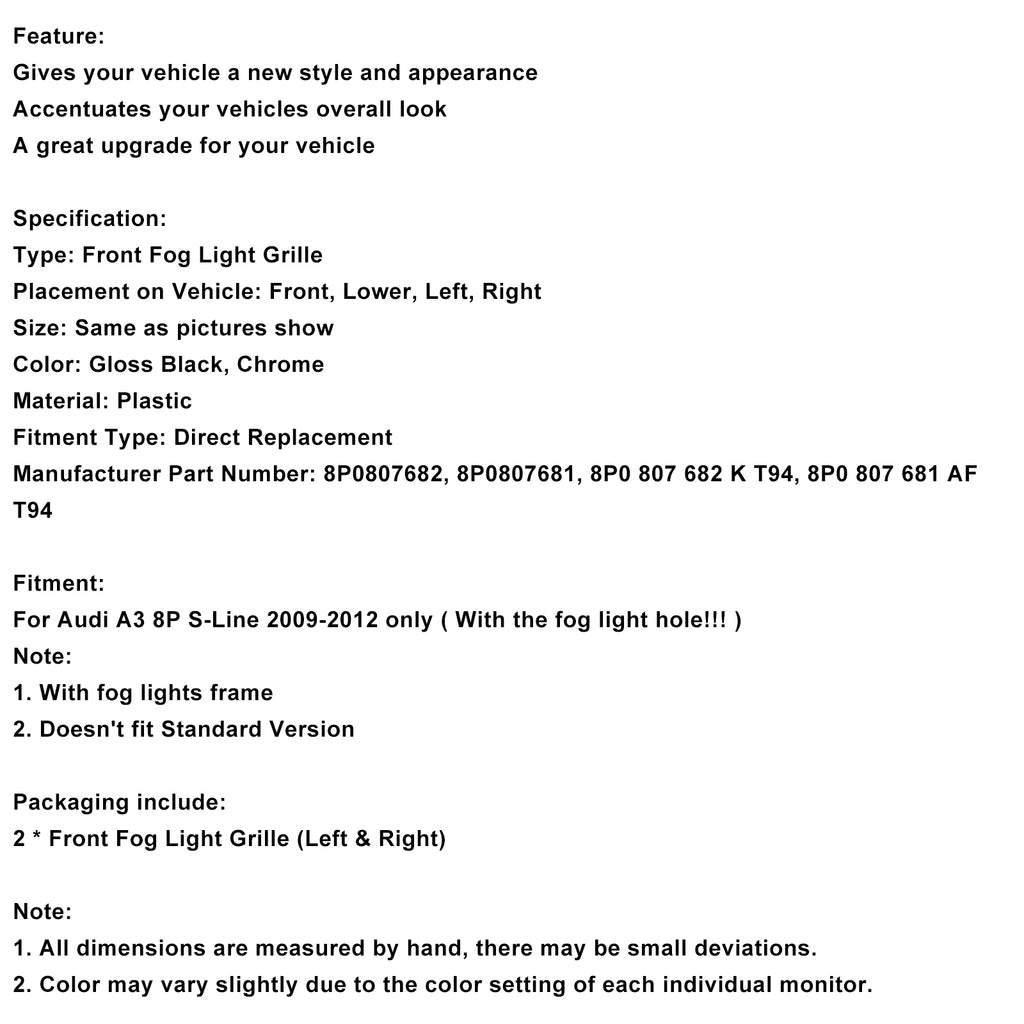 Endast för Audi A3 8P S-Line 2009-2012 (Med hål för dimljus!!!)