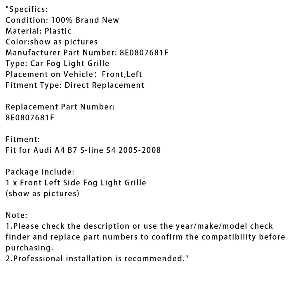 Främre vänster stötfångargrill Dimljusgrill För Audi A4 B7 S-Line S4 2005-2008