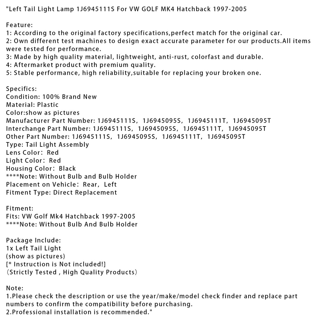 Left Tail Light Lamp 1J6945111S Fit For VW GOLF MK4 Hatchback 1997-2005
