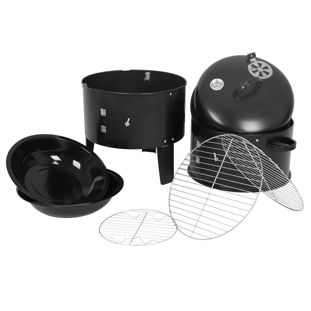 2 lager för grillning, temperaturmätare placerad ovanpå, 2 luckor framtill för kontroll och påfyllning av vatten och kol