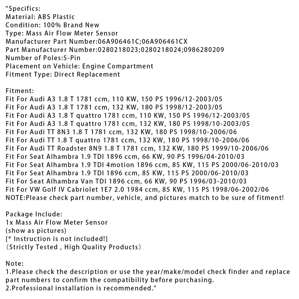 Luftmassemätare för Audi A3 TT Volkswagen Cabriolet 06A906461C