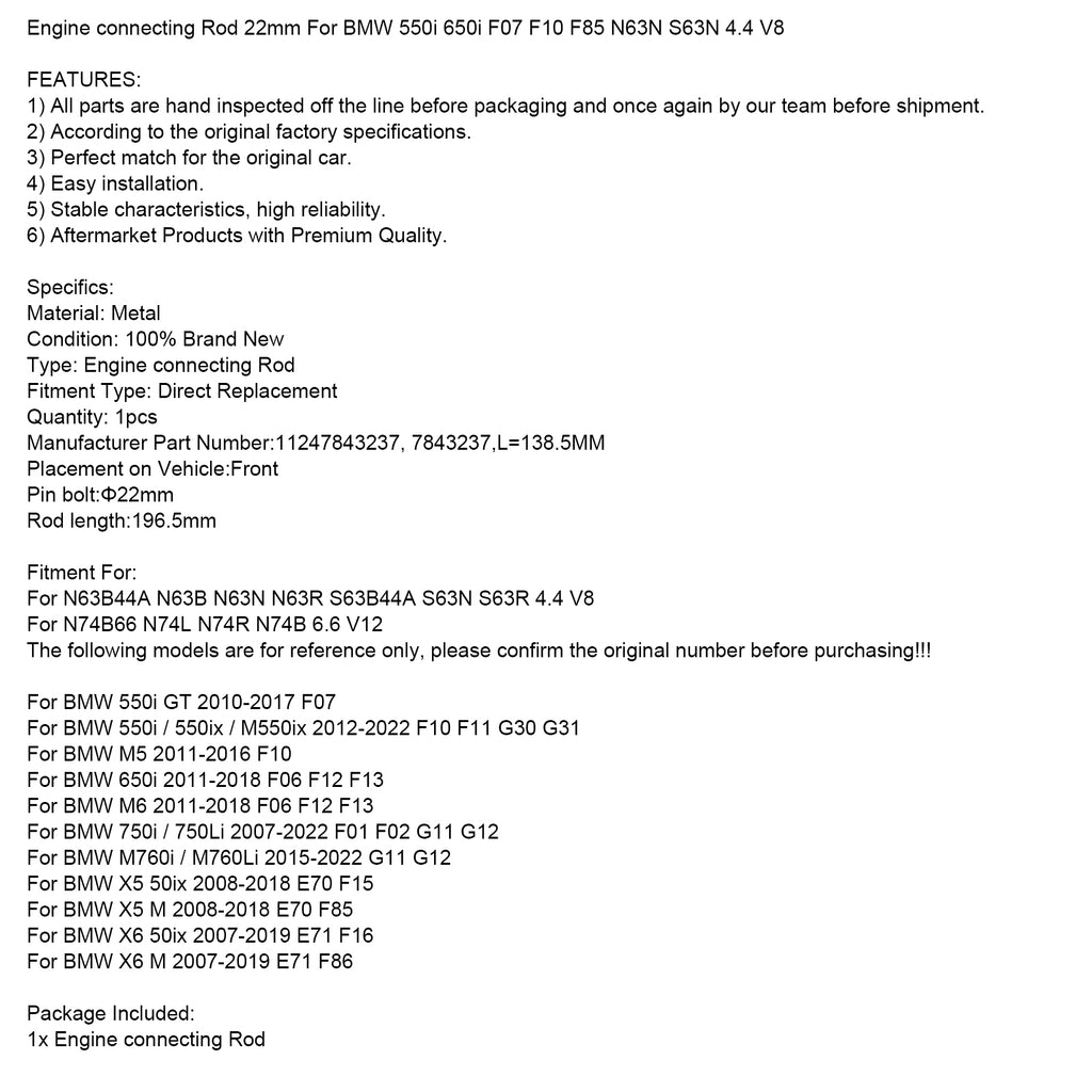 Motorns vevstång 22mm för BMW 550i 650i F07 F10 F85 N63N S63N 4.4 V8