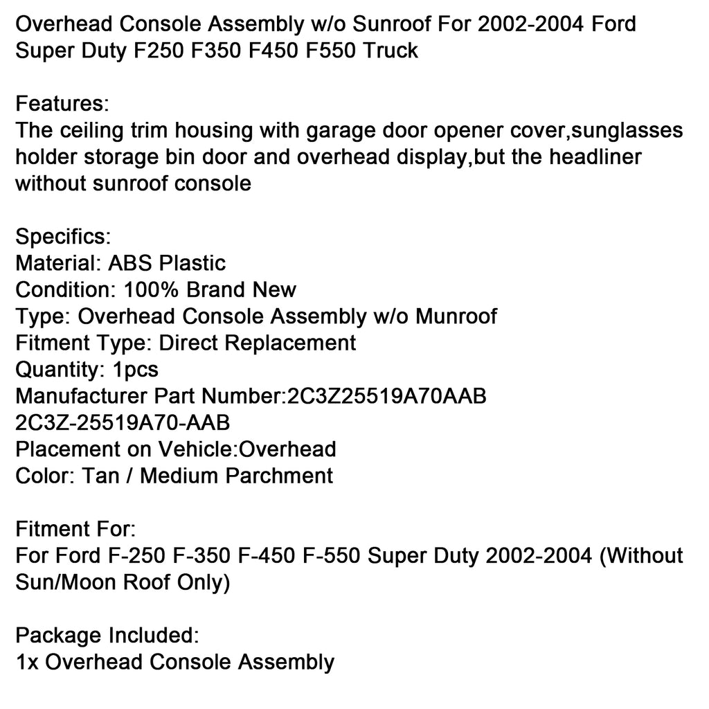 Takkonsol utan taklucka för Ford Super Duty F250 F350 F450 F550 lastbil 2002-2004