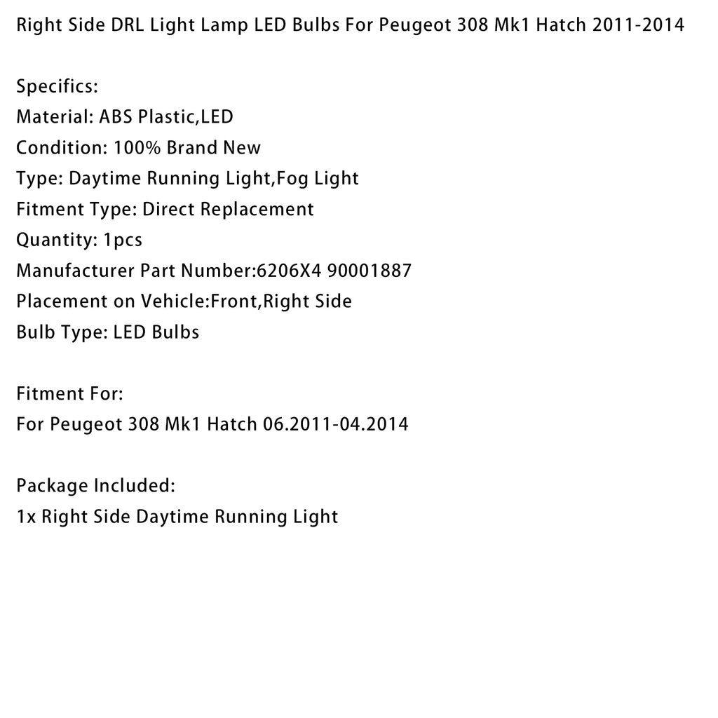 Right Side DRL Light Lamp LED Bulbs For Peugeot 308 Mk1 Hatch 2011-2014