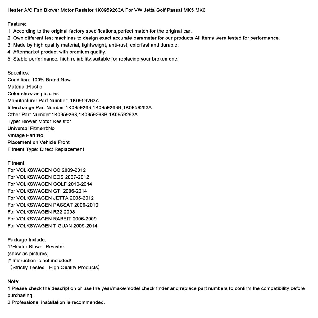 Värme/AC Fläkt Fläktmotor Motstånd 1K0959263A För VW Jetta Golf Passat MK5 MK6