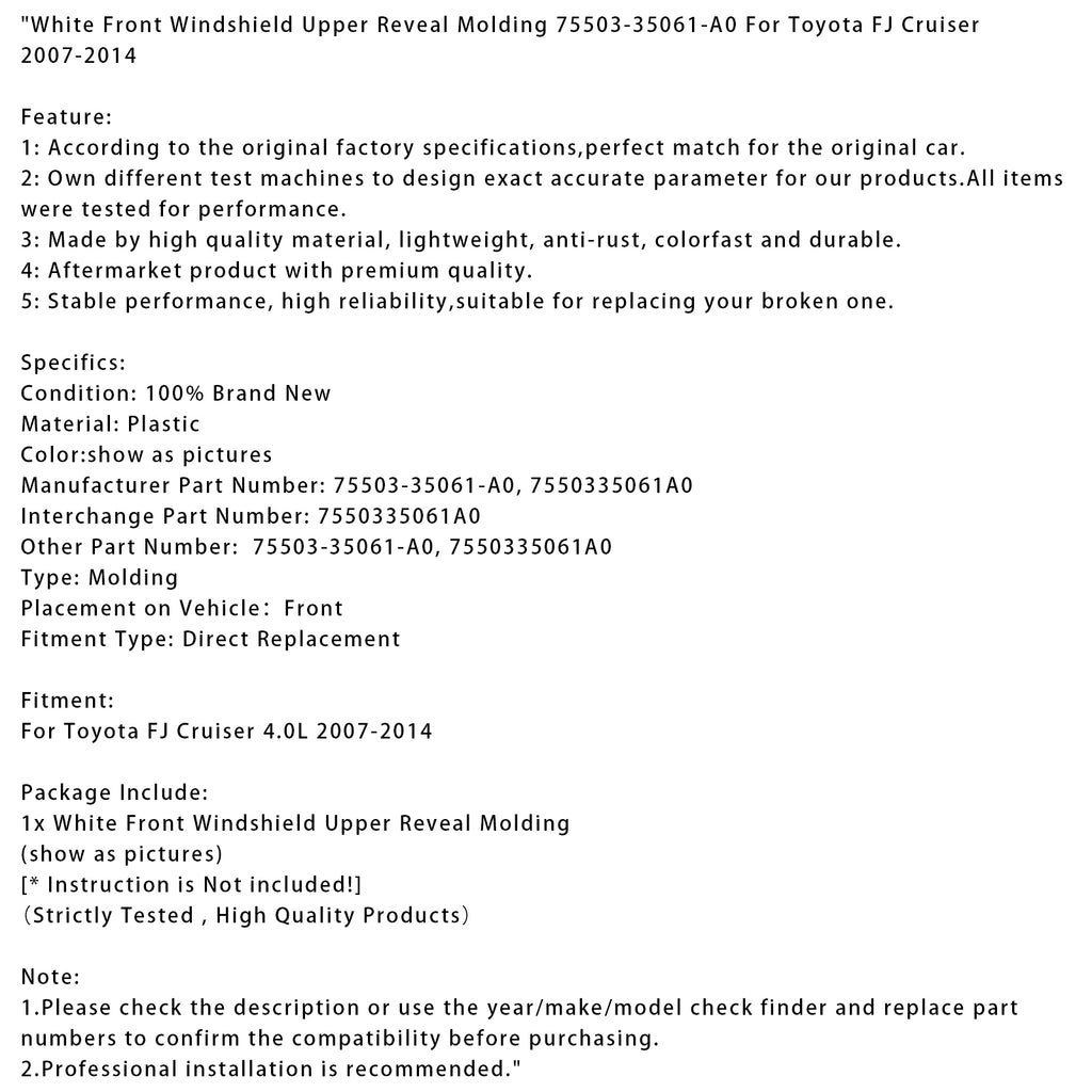 White Front Windshield Upper Reveal Molding 75503-35061-A0 Fit For Toyota FJ Cruiser 2007-2014